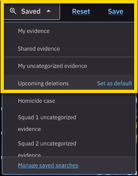- Share your current search: Select Saved, then select Share current search to copy a pre-generated URL for your current search to your clipboard. You can paste and share this URL. When someone opens the link, they land on the evidence search page with the same filters applied. (Evidence access permissions still apply).