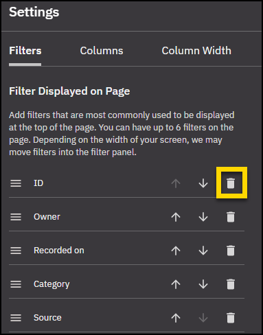A set of four filters appears above the results table by default (ID, Owner, Recorded on, and Category).