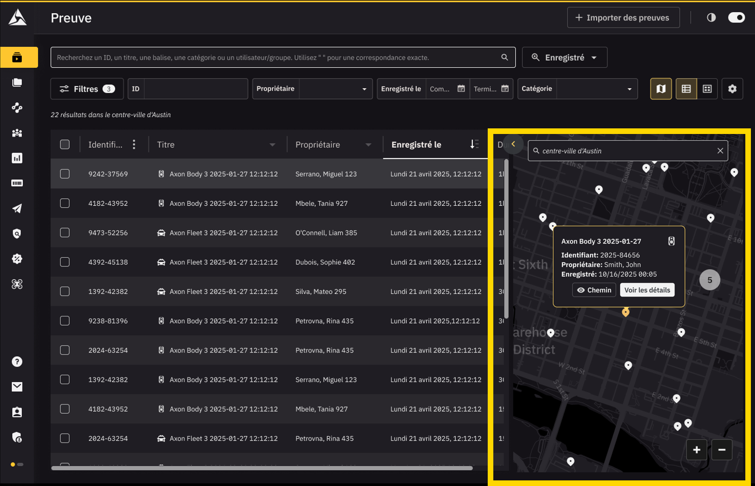 5. Recherche sur la carte – Effectuer des recherches géographiques dans un rayon donné pour trouver toutes les preuves potentielles qui ont traversé une zone, ce qui permet d’établir que des preuves pertinentes sont incluses dans un dossier.