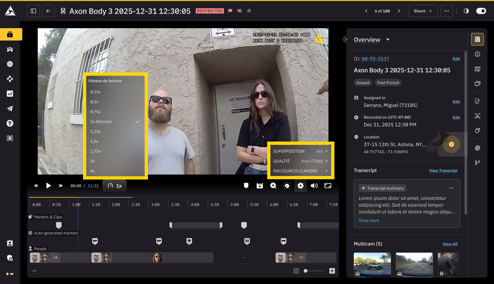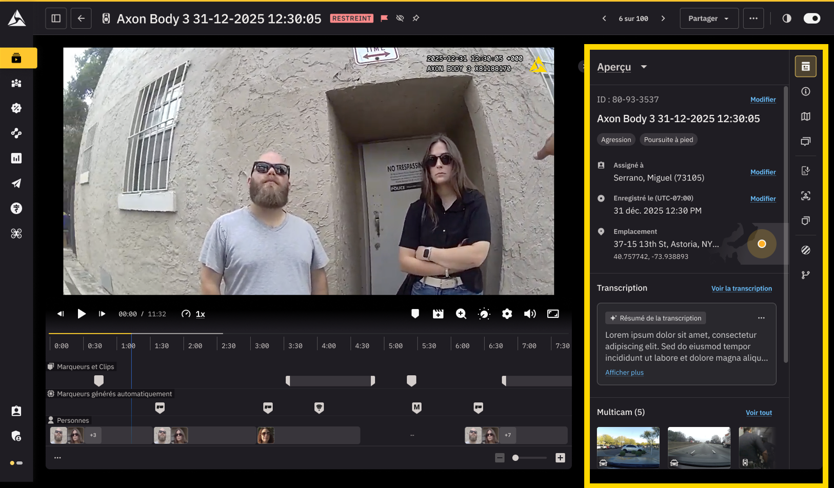 6. Volet d’assistance – Tous les éléments essentiels, tels que les métadonnées, les notes, les transcriptions, les caviardages, les dossiers, etc., sont soigneusement organisés en onglets pour un accès rapide aux bonnes informations.