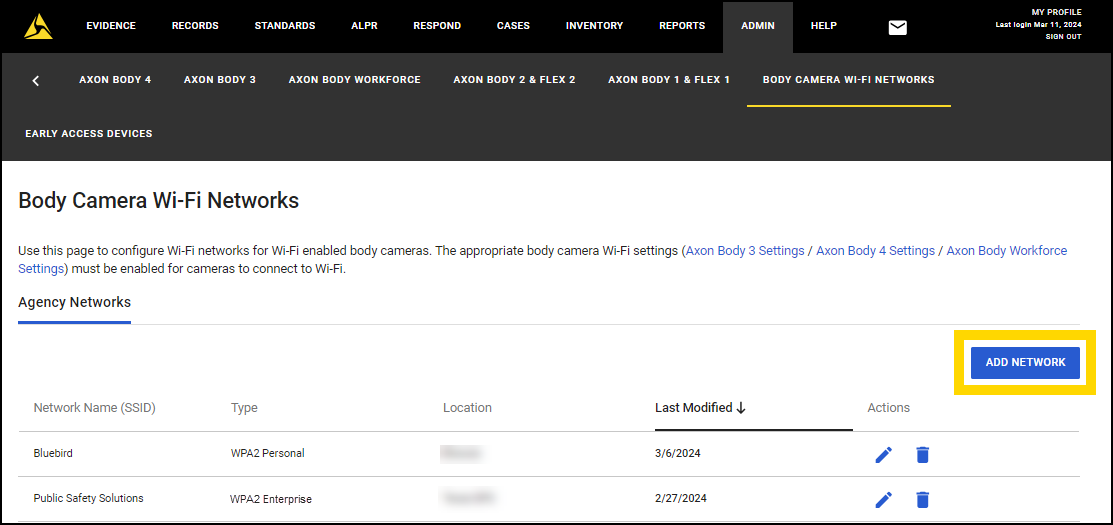 - Select Admin, and then under Devices and Applications select Body Camera Wi-Fi Networks to open the Body Camera Wi-Fi Networks page.