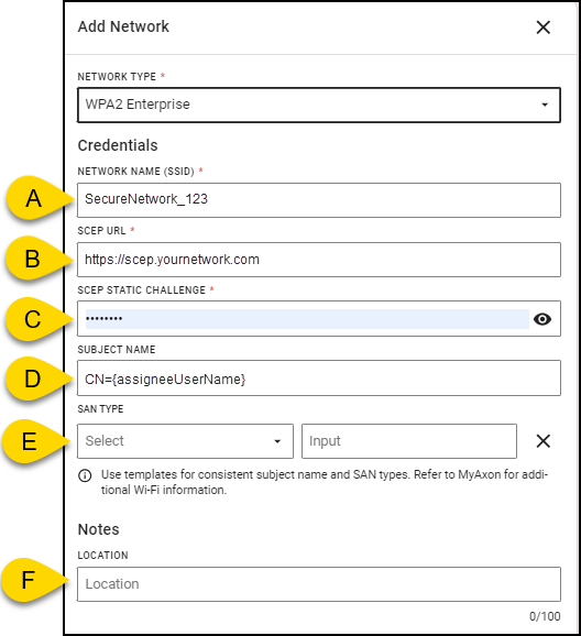 Note: Templates such as {assigneeEmail}, {assigneeUserName}, and {serial}, can be used in the Subject Name and SAN Type fields to dynamically match your configuration. These templates are case insensitive and will resolve to the specific assignee data for each BWC. Ensure corresponding accounts are properly configured in your identity server to match these details.- Network Name (SSID) - Enter the SSID of your Wi-Fi network.