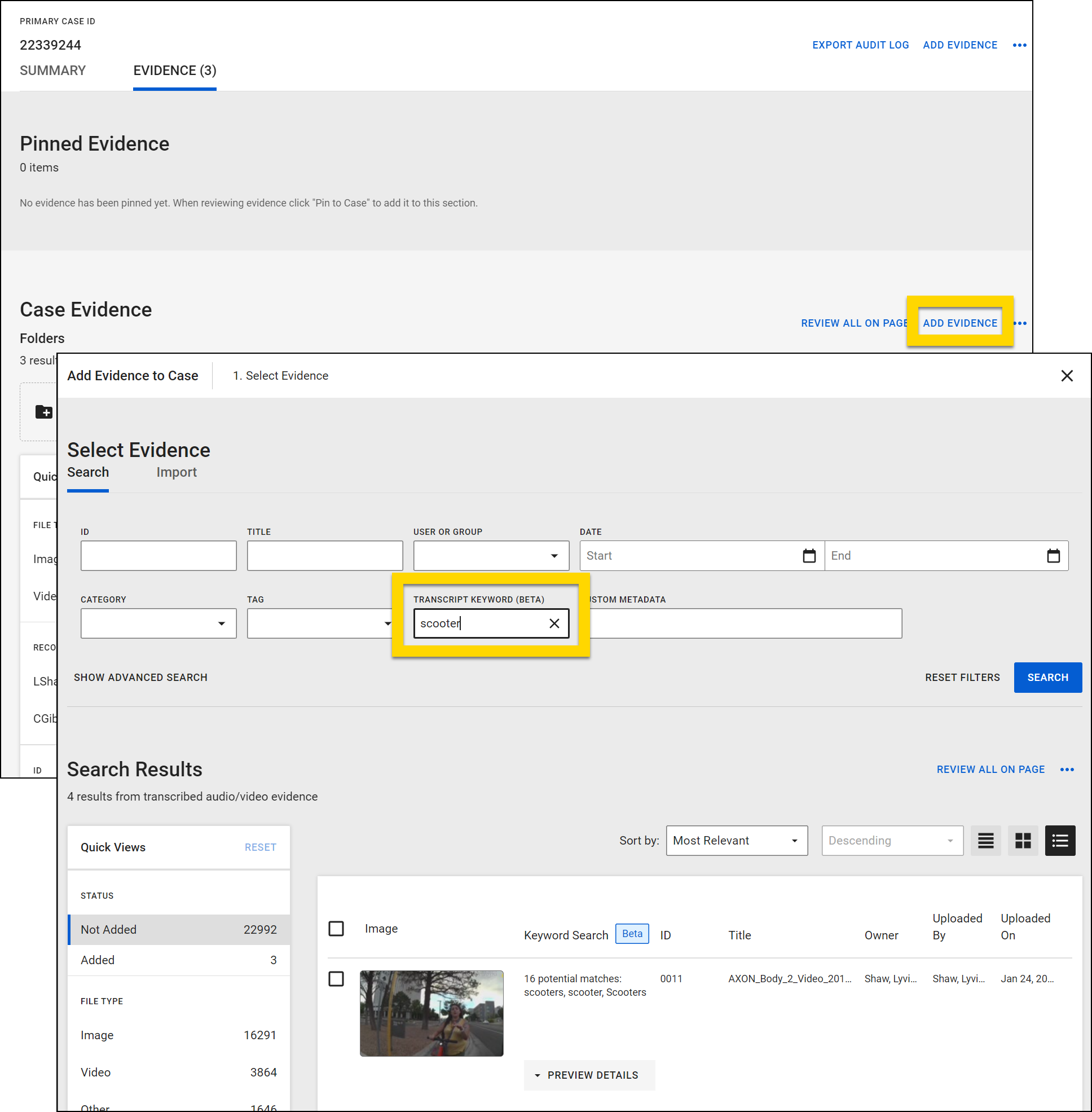 The Transcript Keyword filter also appears and functions as outlined above when you are searching to add evidence to a case.