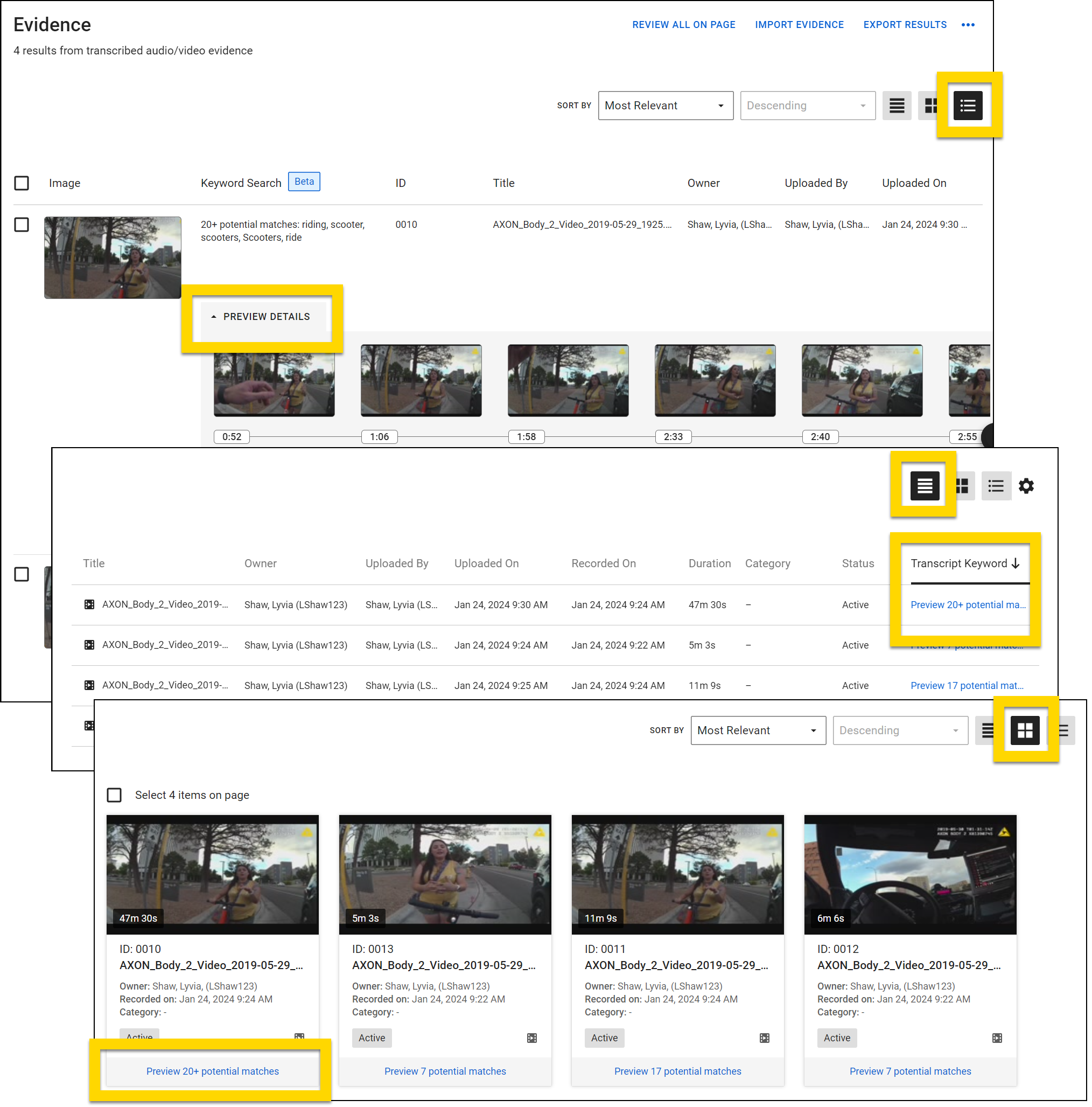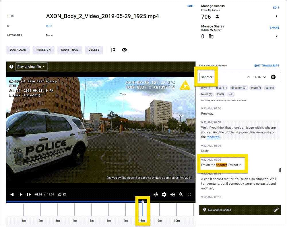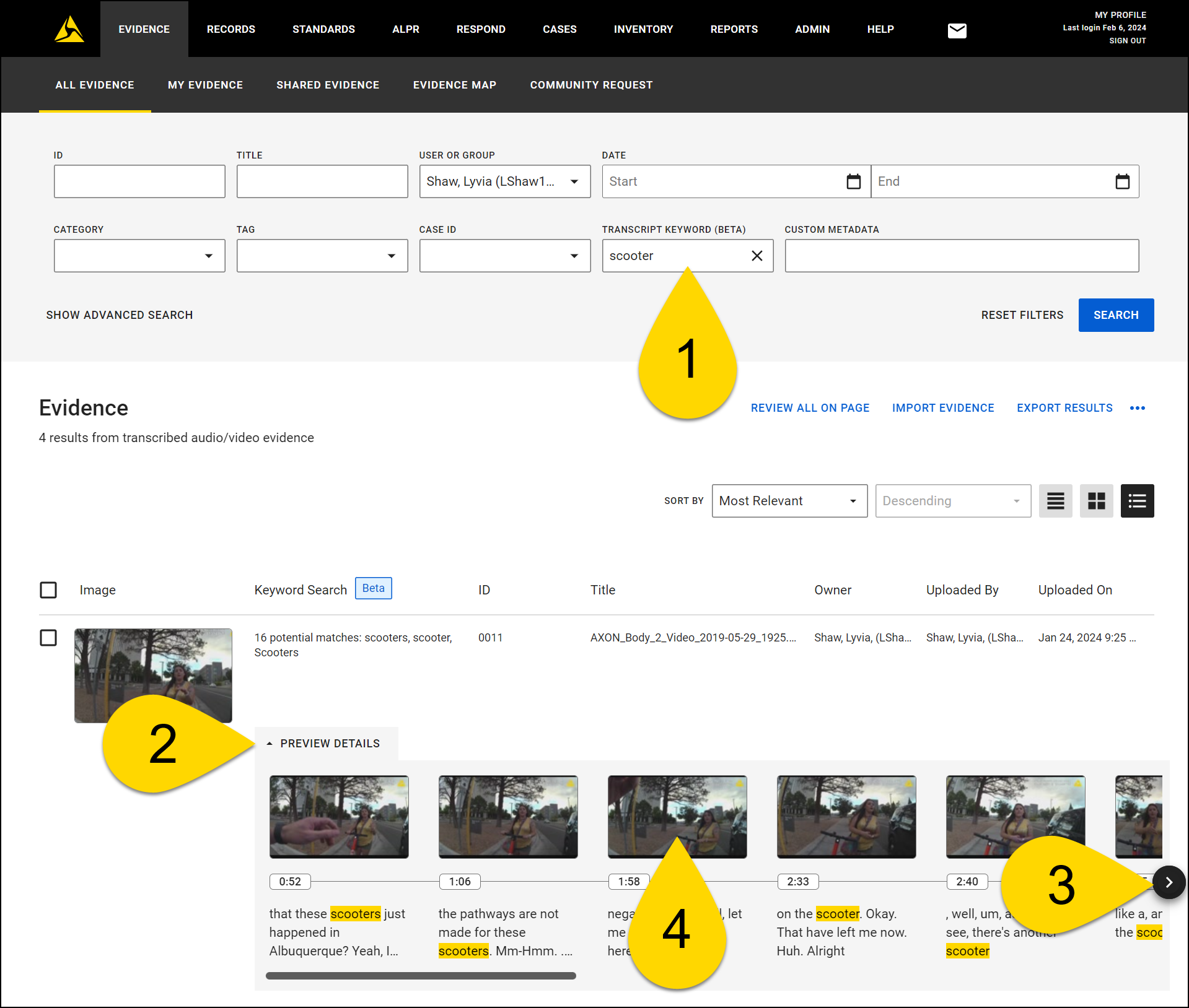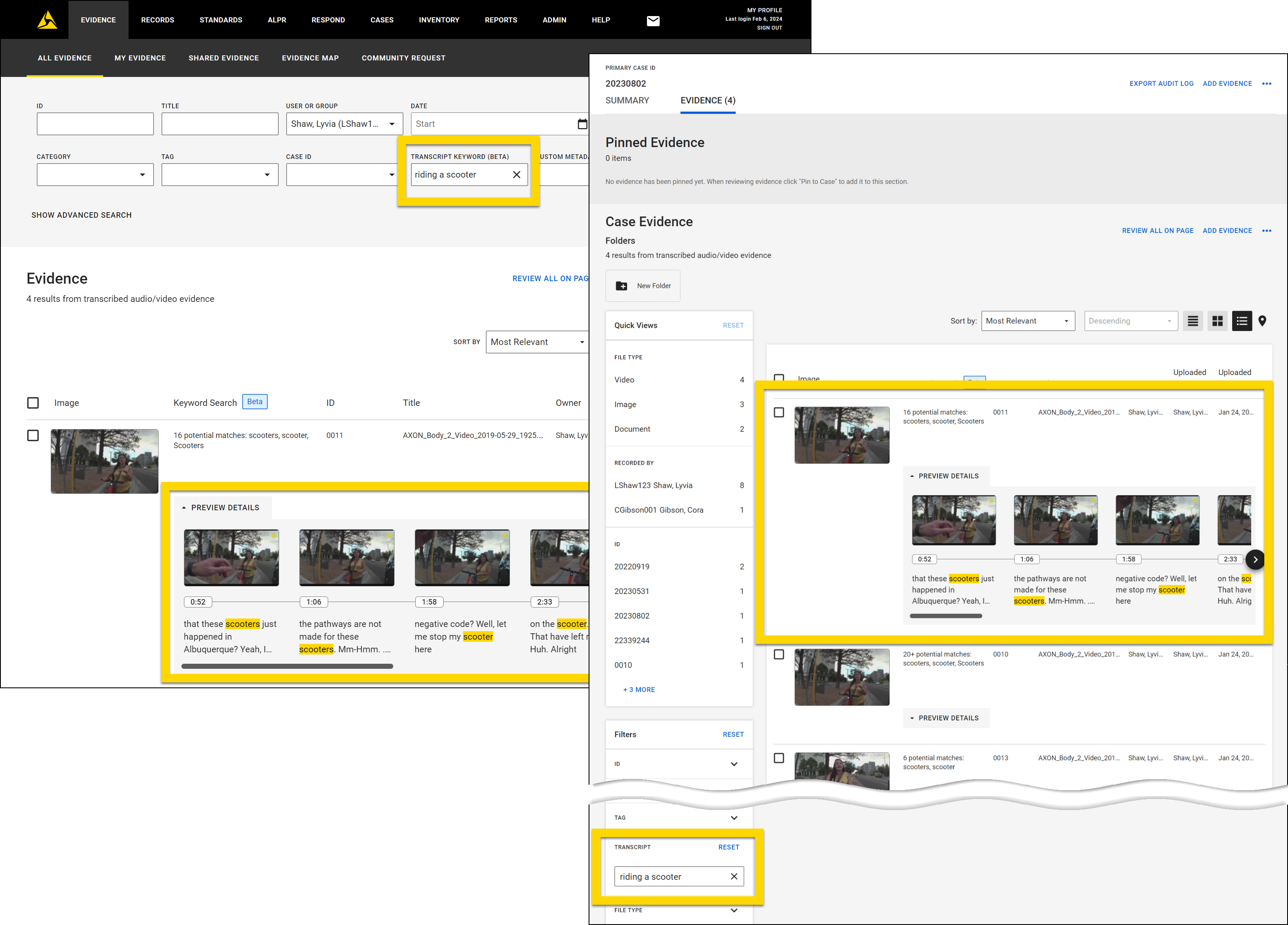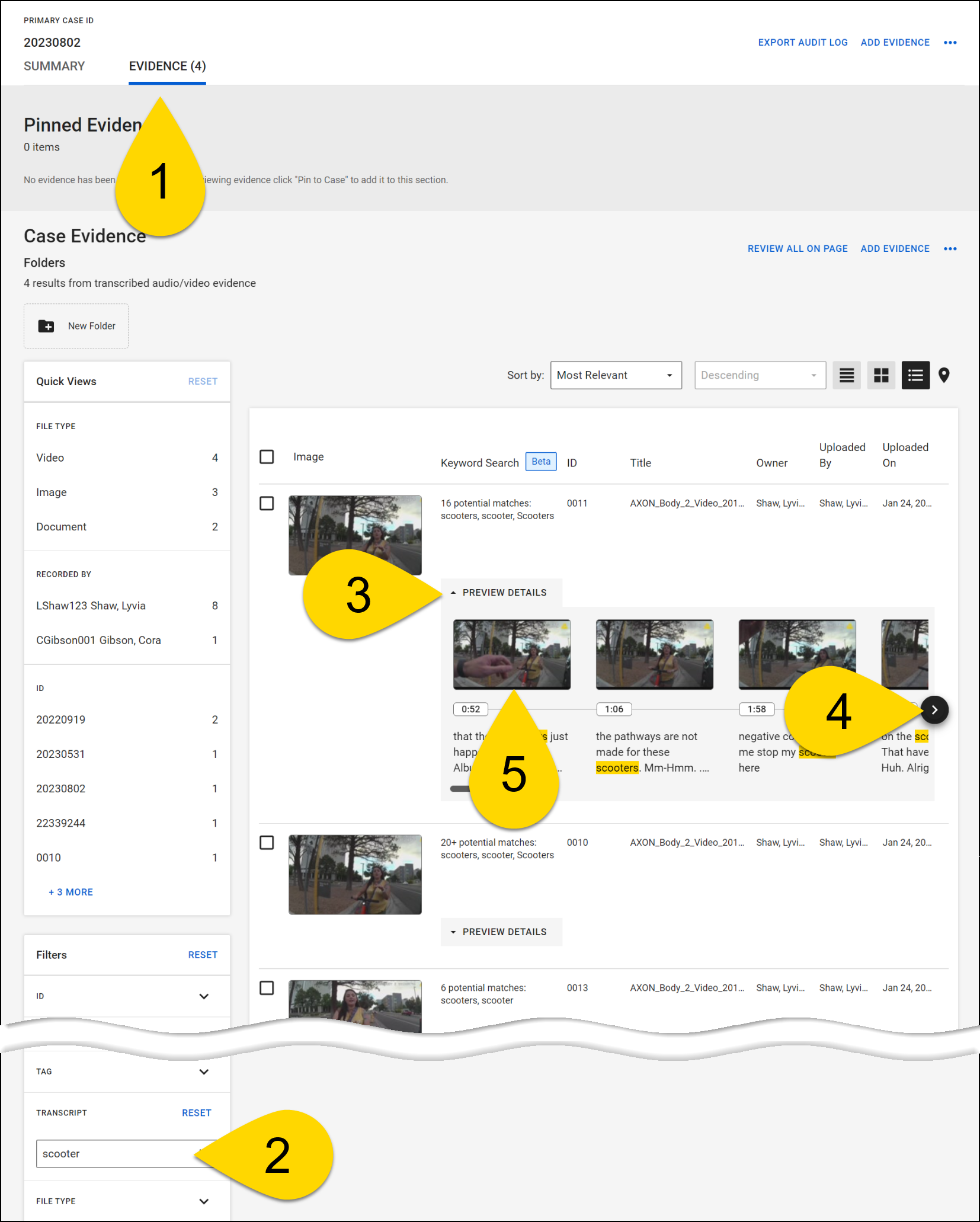 - Select a thumbnail to open that piece of evidence to the moment that keyword appears. The keyword you entered in the Transcript Keyword search is auto-filled in the search box that appears above the transcript on the evidence detail page.