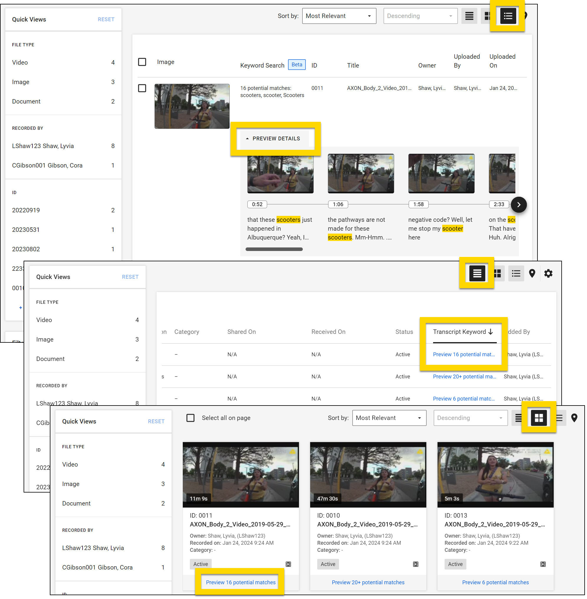 The Detail view that includes the Preview Details section only appears when the Transcription Keyword filter is used. If you switch to Table or Grid view, you can select a Preview button that will return you to the Detail view with the Preview Details section already expanded.