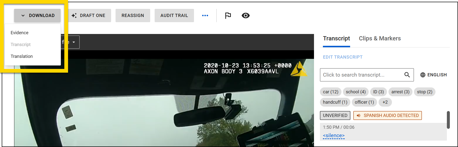 Because translations are not saved and must be regenerated each time you access the evidence, it can be helpful to download and save them. To do this, select Download > Translation.