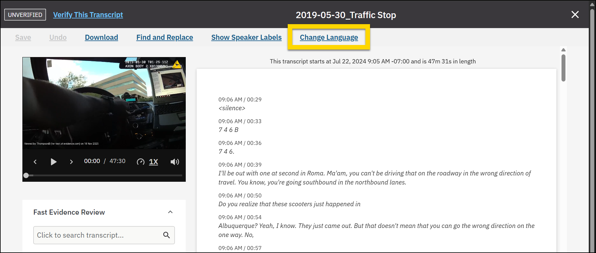 Automatically transcribed files (e.g., body camera and Axon Capture recordings when on the Unlimited plan), appear in the default language defined by the organization's administrator.