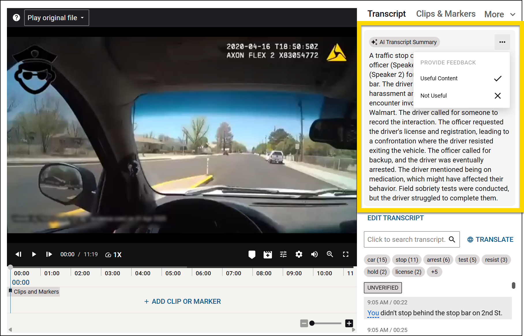 To help Axon improve this feature, select the More Actions [...] menu to indicate if the summary contains useful or not useful content.