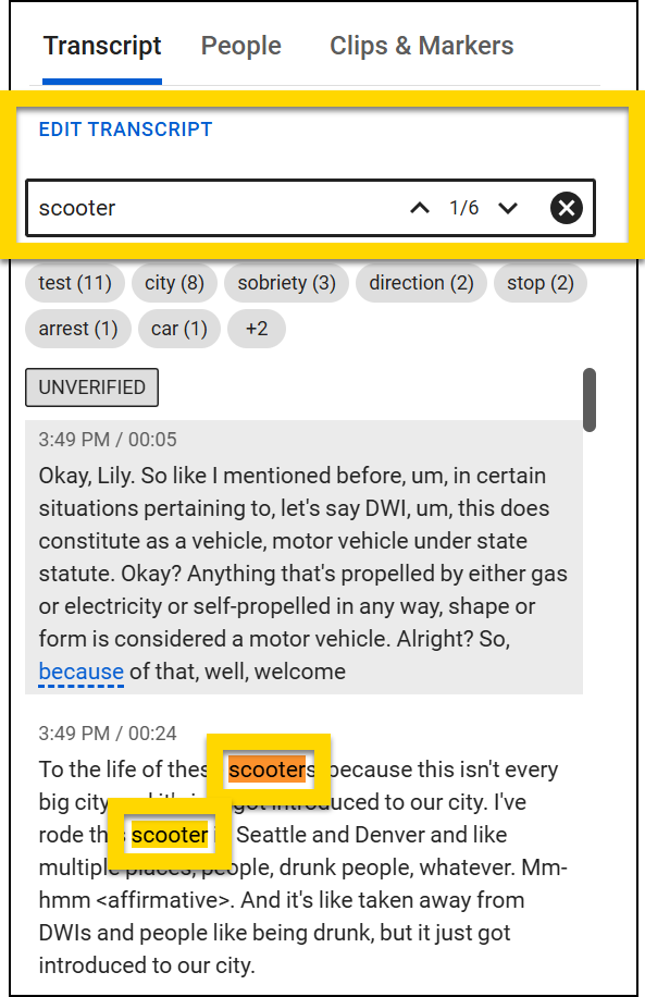 When viewing the Auto-Transcript from the evidence detail page, use the search box that appears above the transcript to find where specific words were spoken in the evidence.
