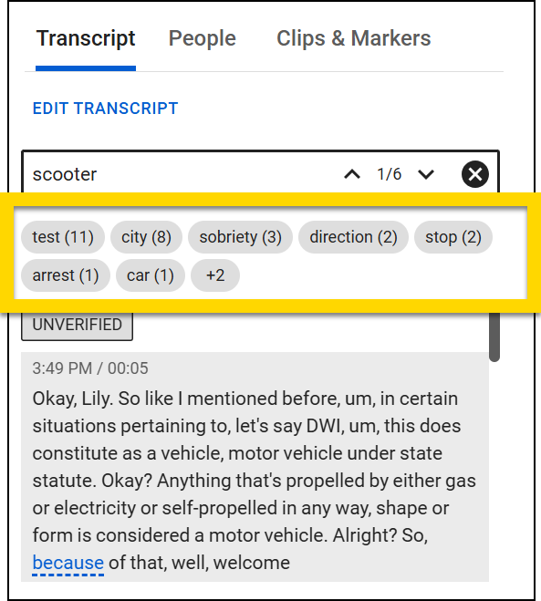 Select a word to highlight all instances of that word in the Auto-Transcript. The word will appear in the search box, and you can use the arrows to jump between each instance.
