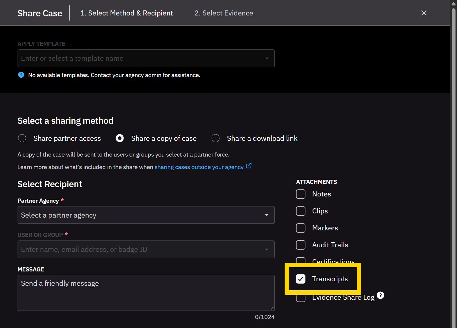 When sharing using the Share Partner Access method, if Auto-Transcripts have been generated for the shared evidence, they will be included in the share. You can select to include Transcripts when sharing using the Share a copy of case or Share a download link share options.