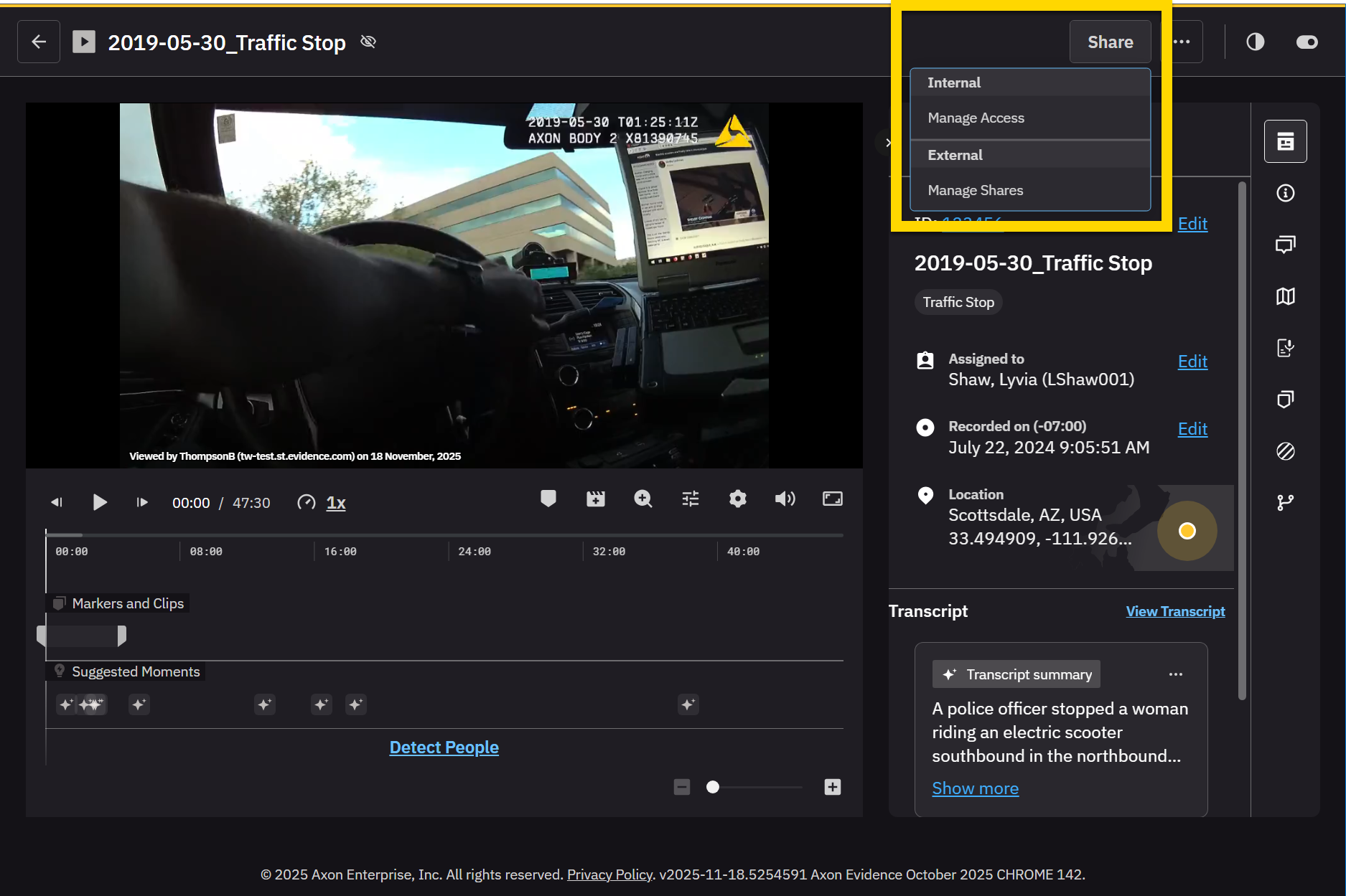 To manage who can access the evidence and Auto-Transcript, open the evidence details page and select either Manage Access or Manage Shares. See Evidence details page - Share for more information about evidence access control lists and sharing evidence.