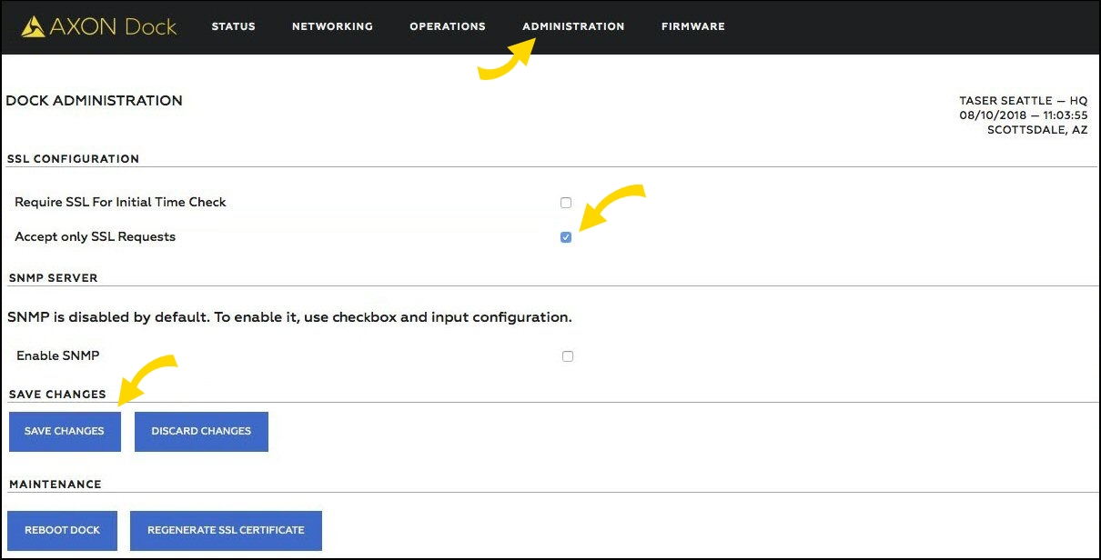 The Axon Dock administration interface for legacy docks uses HTTP by default when connecting with a browser (this connection is unrelated to the dock's HTTPS connection to Axon Evidence). For an added layer of security when connecting, you can enable HTTPS.
