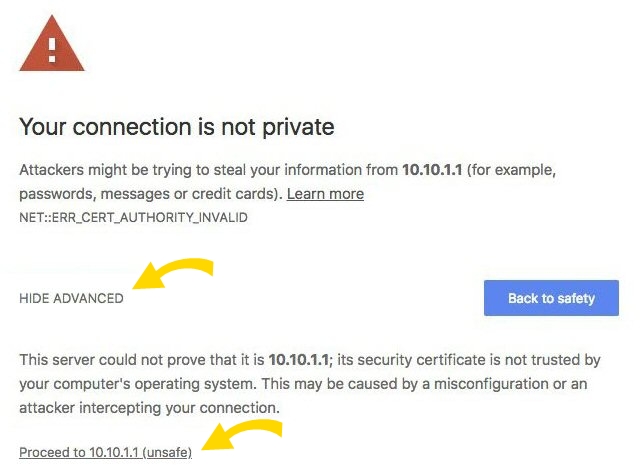 - Select the option that lets you add the exception and install the dock security certificate. Each browser has a slightly different workflow; the above is from Google Chrome and requires you to select Show Advanced (which then becomes Hide Advanced) to show the lower part of the screen, then Proceed to 10.10.1.1 (unsafe).