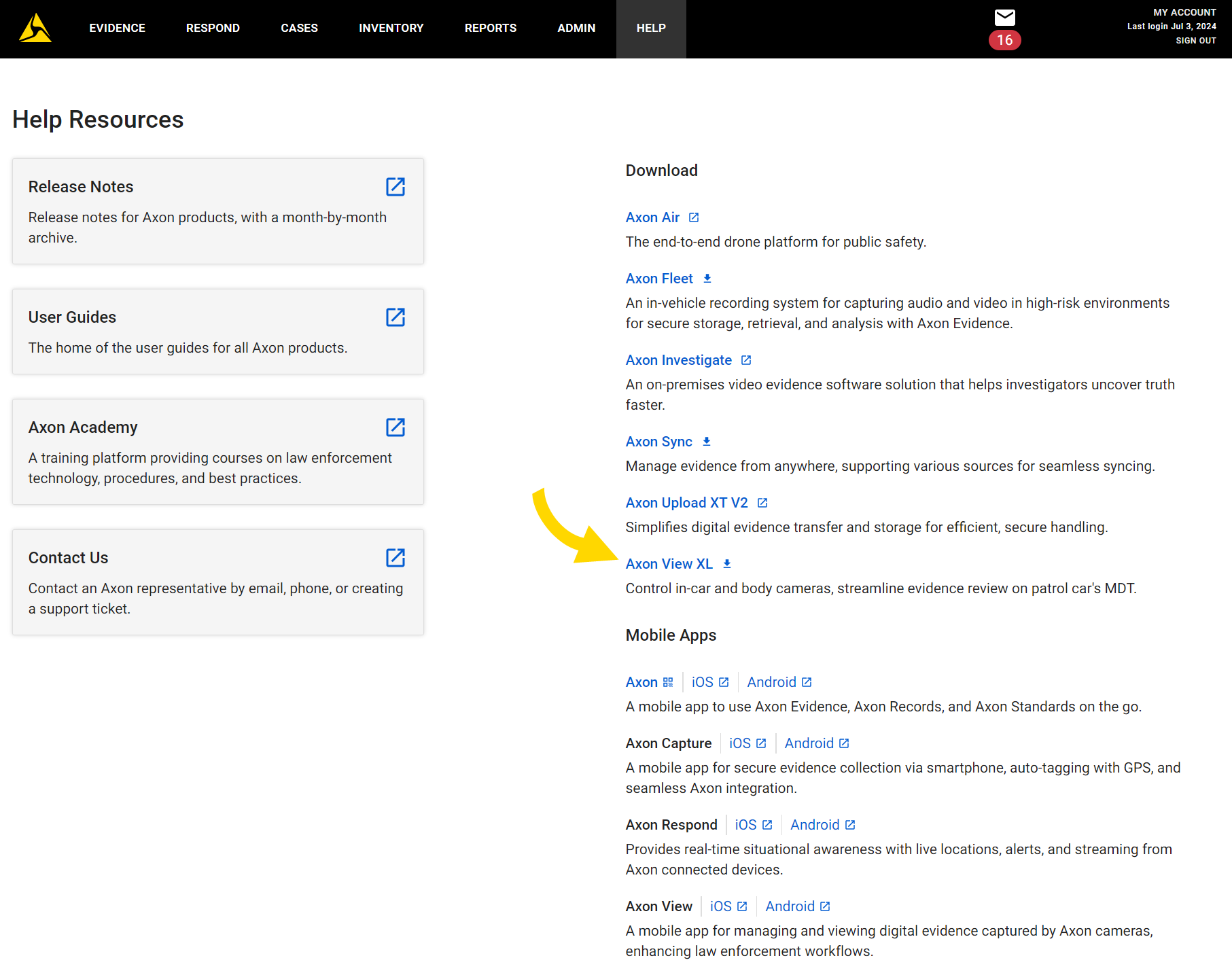 Shows the link on the Help page in Axon Evidence to download Axon View XL.