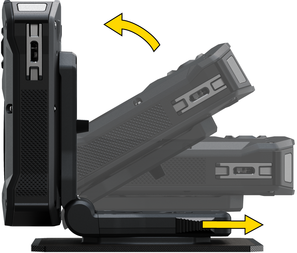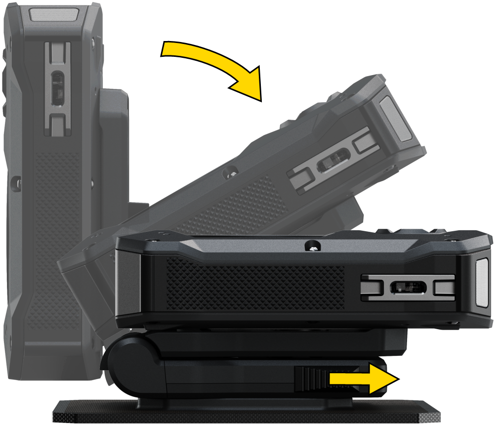 - Pull the finger tabs on both sides of the mount rearward to allow the body camera to spring open to the upright working position.