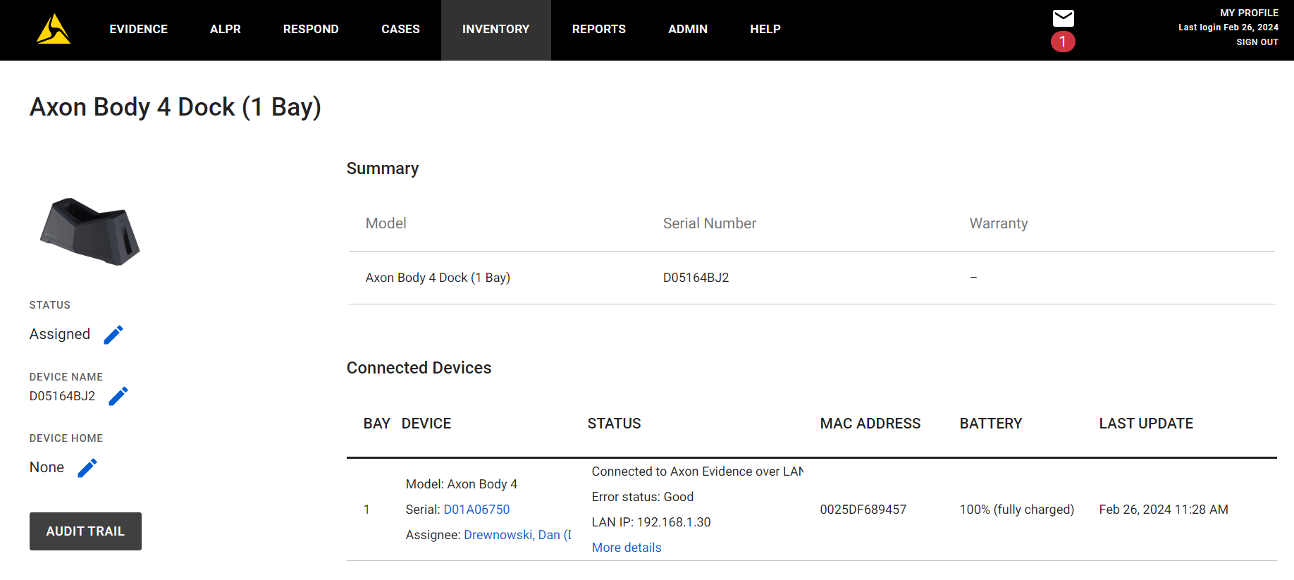 Information about an Axon Dock and the devices connected to them is available in your agency’s Axon Evidence account by going to the Device Profile page for the dock. Your dock must be registered (see next section) to use this page.