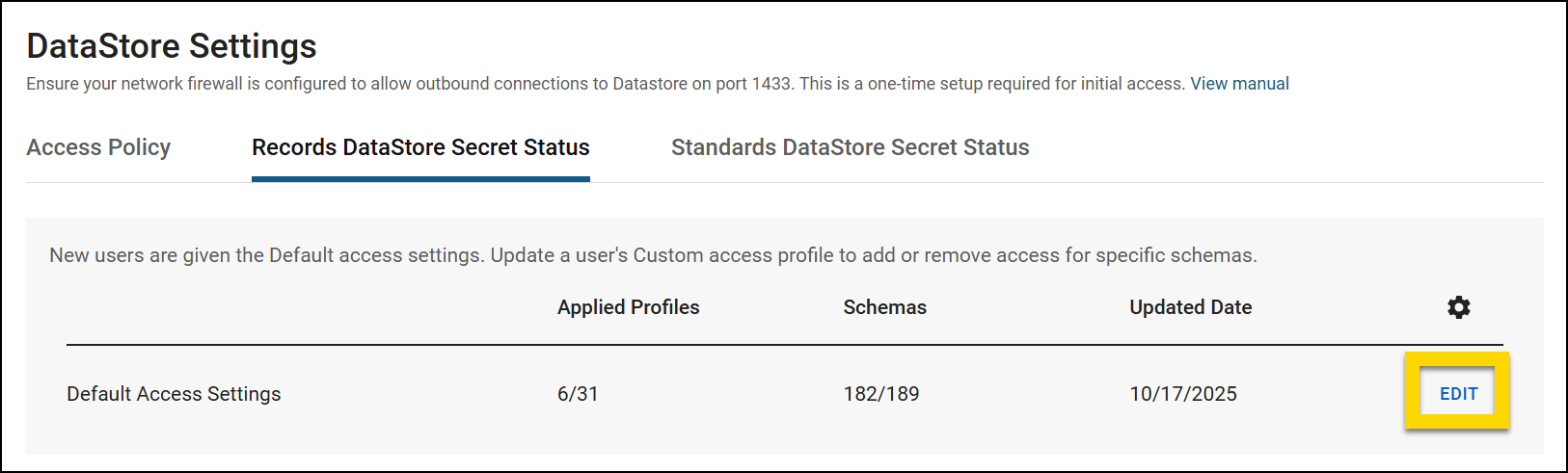 The top section on the Secret status tabs displays the settings for your organization's default access profile. The default access profile is applied whenever you give a new user access to the DataStore and gives users access to a predefined set of accessible views and schemas.