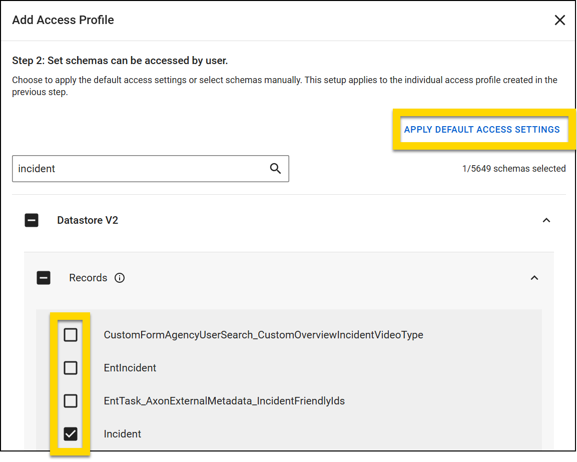 - Use the checkboxes to set which schemas are included in the default access profile.