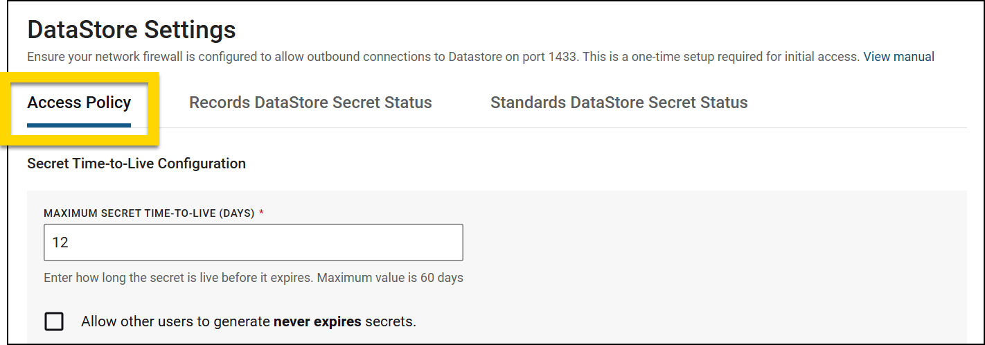 Note that during secret generation, you can enter a TTL in hours, which allows for more granular control than the days setting in the DataStore Settings tool. However, the number of hours you enter during secret generation must be equal to or fewer than the day duration specified in this field in the DataStore Settings tool.