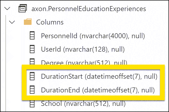 In the Axon DataStore, you can recognize if the data type is a datetimeoffset if the time zone offset appears at the end in the format [+|-] hh:mm. A SQL Client like Azure Data Studio shows the column data types in a view: