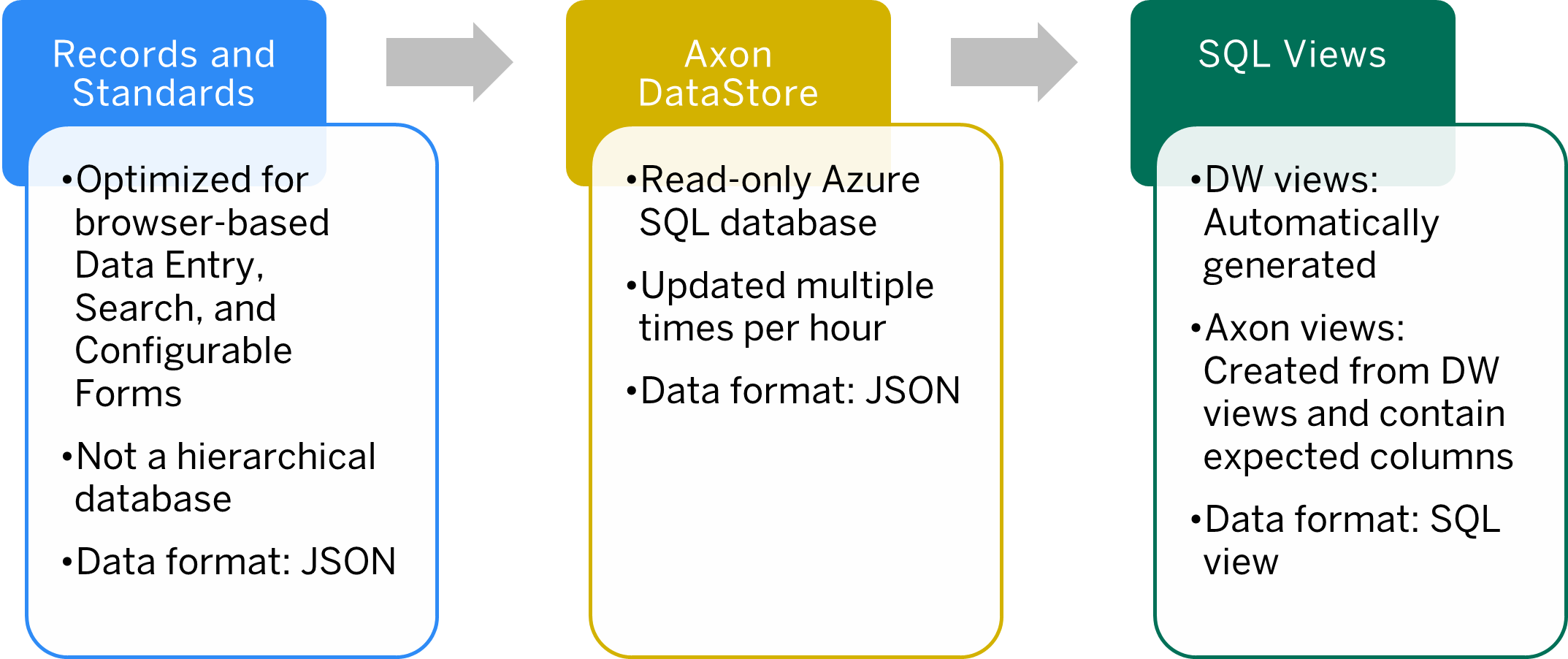 Data is regularly pushed from Axon Records and Axon Standards and arrives at the Axon DataStore in a raw JSON format where it is displayed in a SQL View.