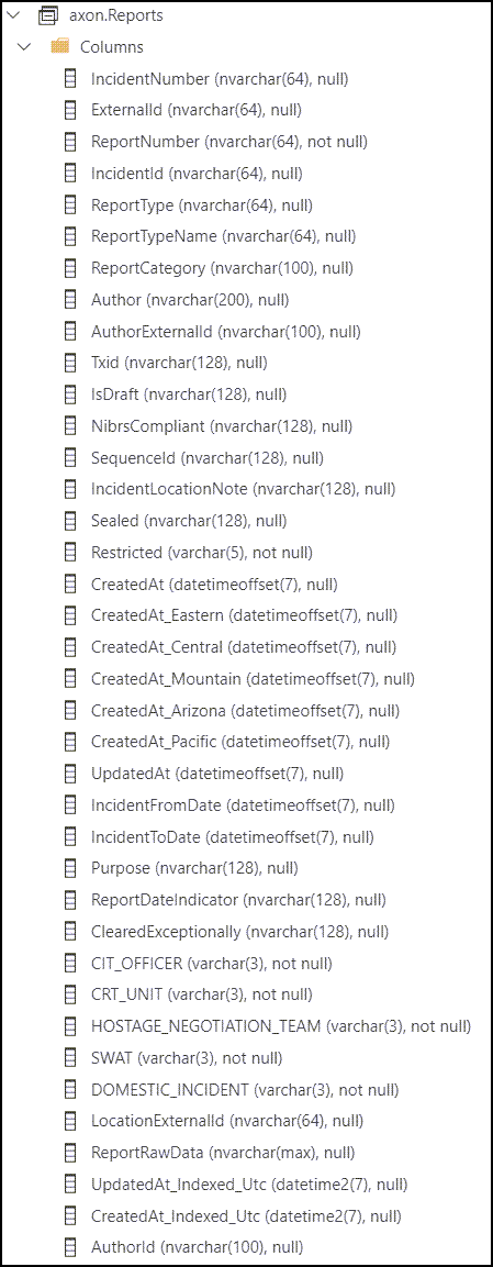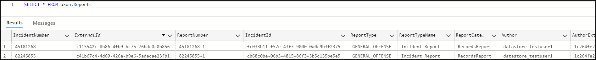 For a full list of how the fields in the Axon Records Incident Report map to the columns in the Axon DataStore, see Axon Records DataStore field mappings.