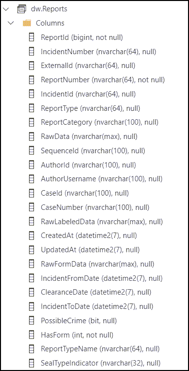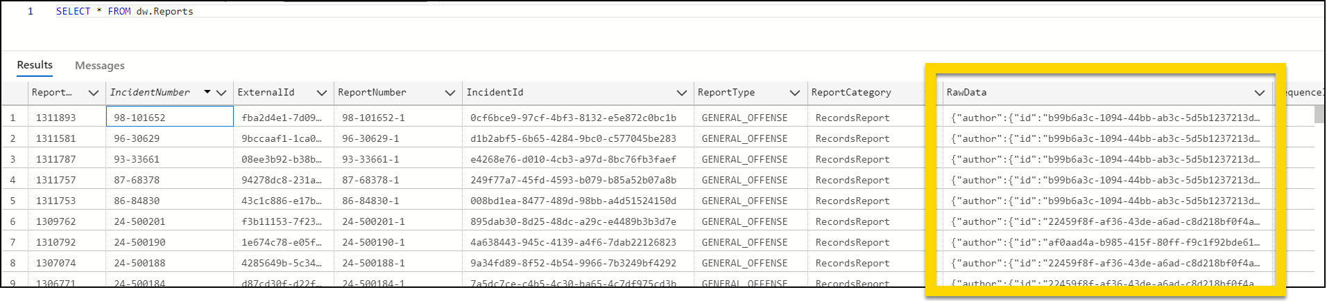 The images below show the RawData column, as well as all other columns that appear in the dw.Reports view:
