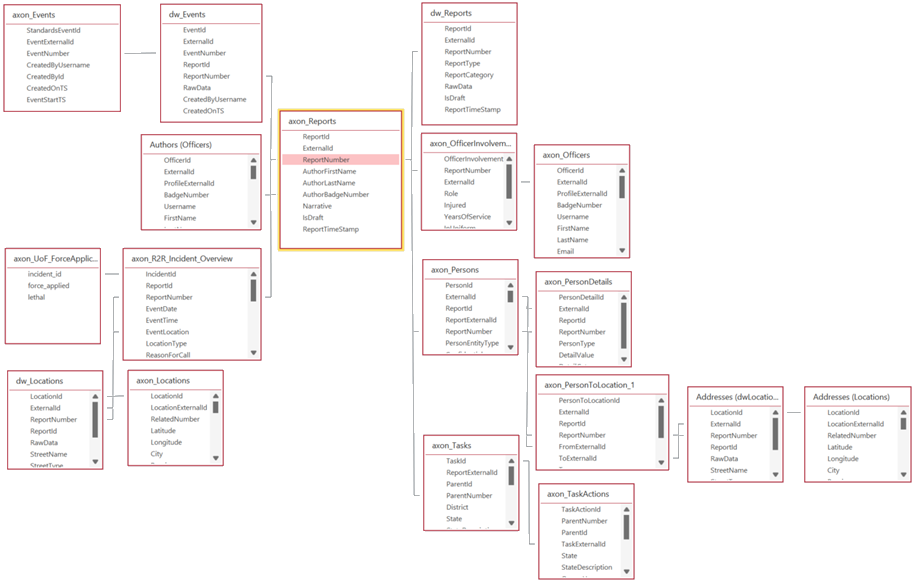 All forms and events recorded in Axon Records and Axon Standards are broken down into Data Warehouse (dw) views. Under the latest “Medium-Rare” schema, the Data Warehouse views are further broken down into corresponding axon views. Most axon views also contain a RawData column where you can find all the data from the front-end, including data that is not parsed into individual columns.