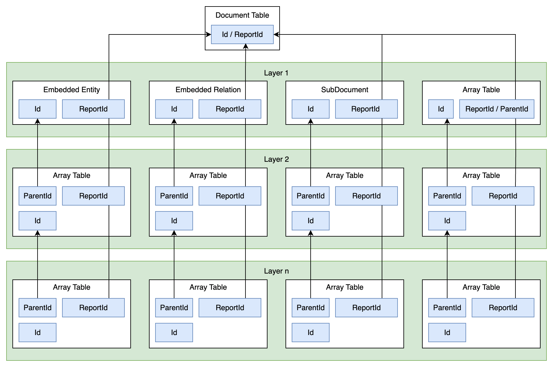Idcolumn. - For embedded entity, subdocument, and embedded relation tables, the primary key is a composite of (