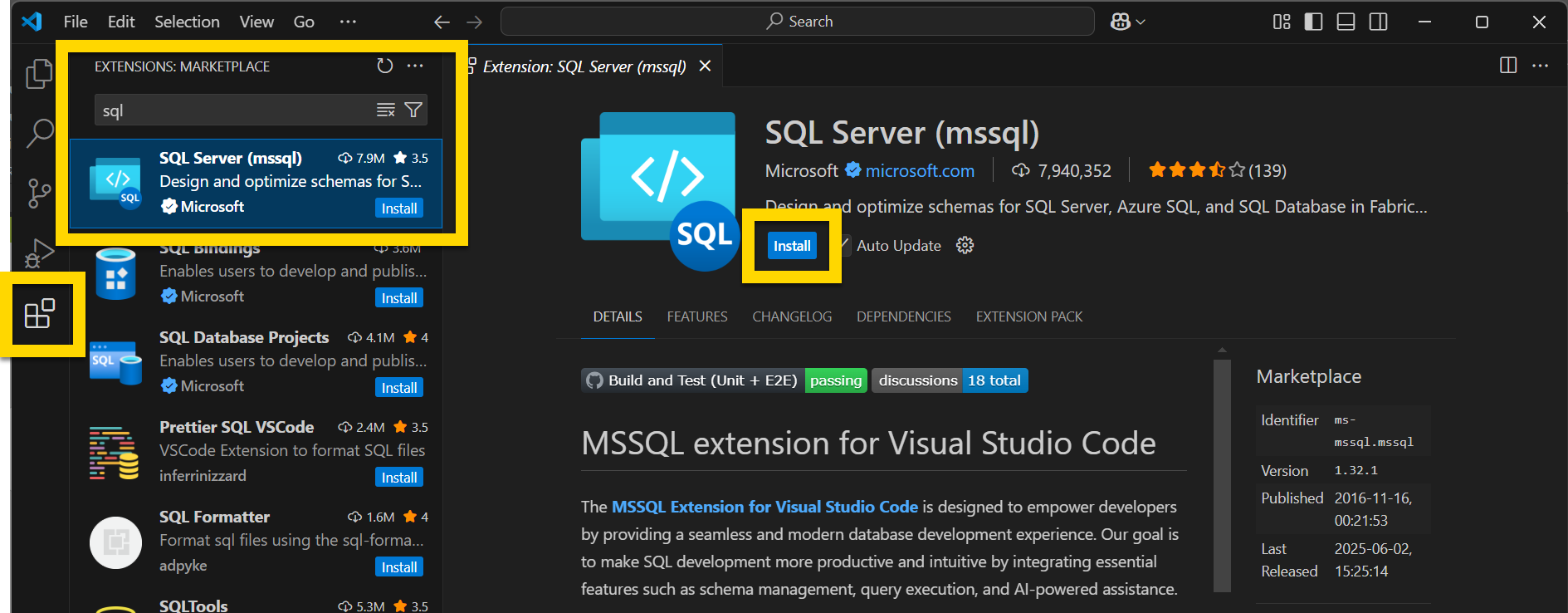 - Enter "sql" in the search box and select SQL Server (mssql).