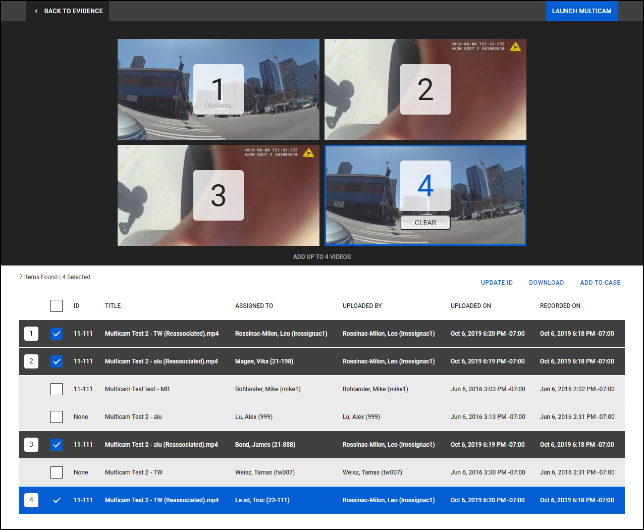 When you select Multicam on the evidence view, the Multicam evidence selection page appears and you can select up to four related videos for simultaneous viewing. The upper section of the page shows the currently selected videos and the lower section lists related videos.