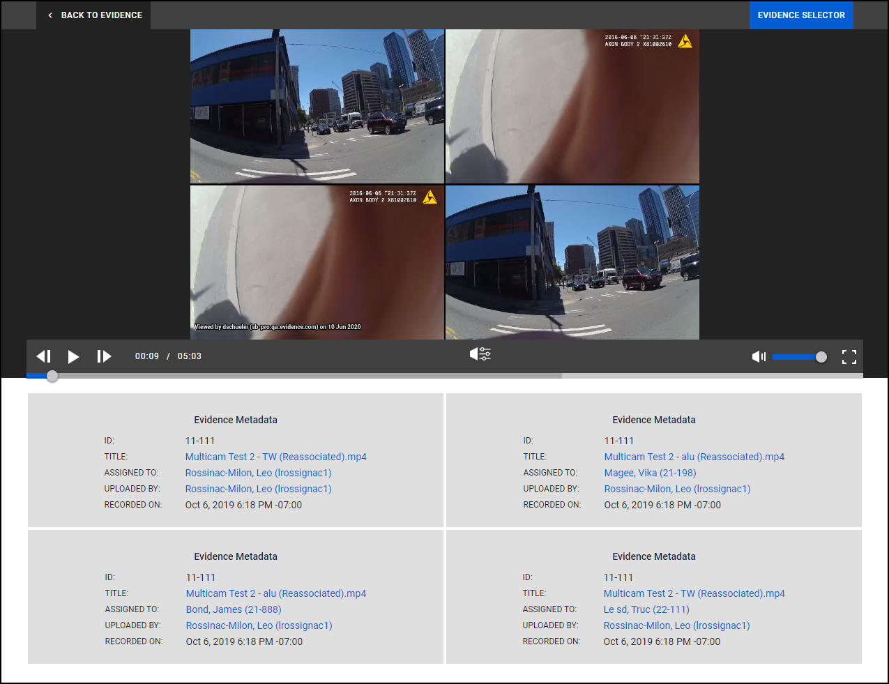 WIth Multicam playback, the selected videos are requested from the system and synchronized. The upper section of the page shows the videos and standard media player options while the lower section shows information about the evidence files. Multicam playback uses standard media player controls.