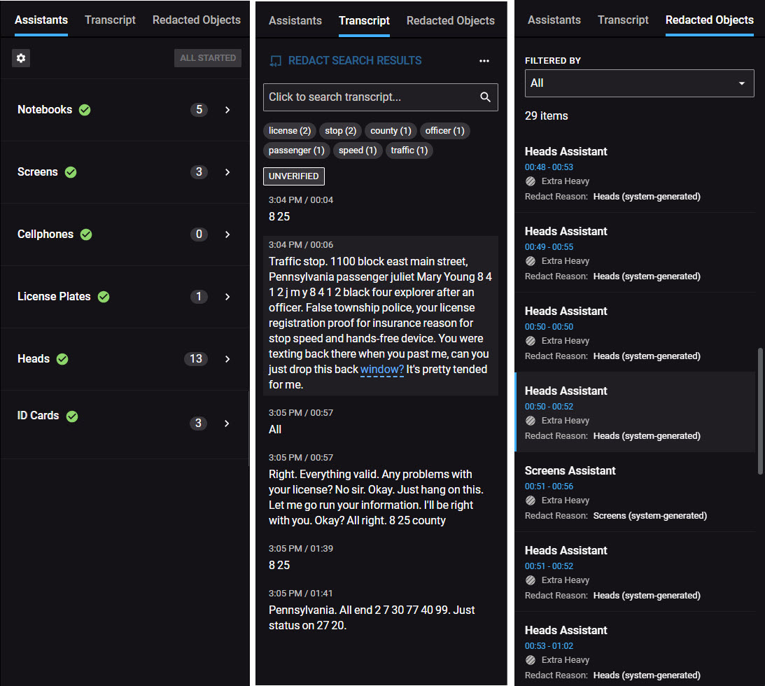 - Assistants: Categorize and display the notebooks, screens, license plates, heads, and ID cards found within your redactions.