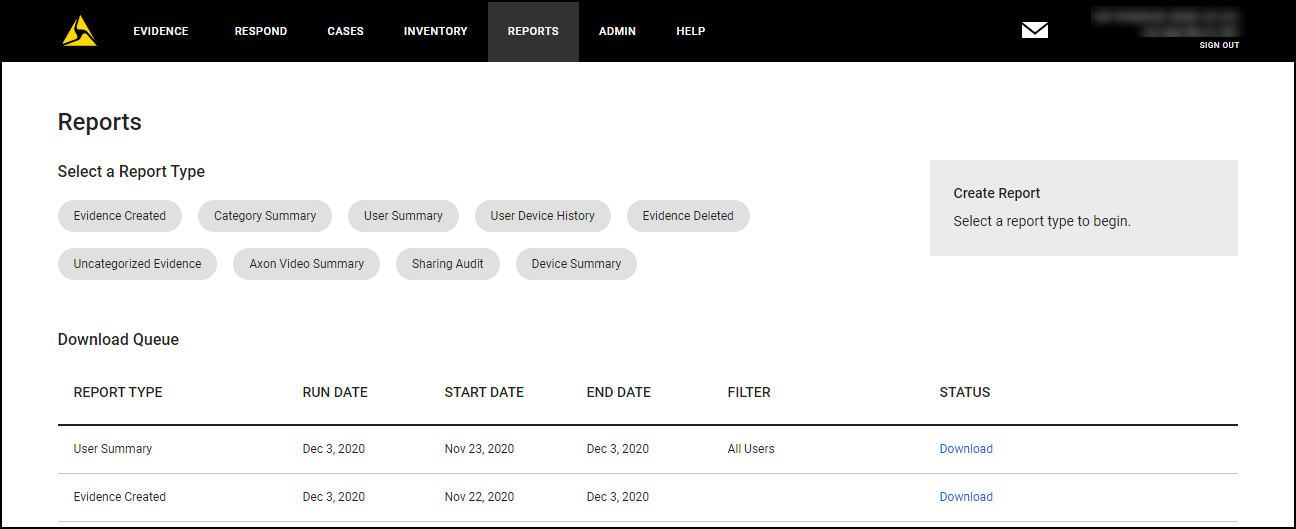 When the report is ready, Evidence.com sends you a notification email that includes a download link. - If the report status is Download, click Download.