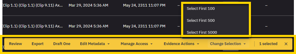 By default, when you select all, up to 500 pieces of evidence are selected (or fewer if fewer results are available). The number of items selected appears on the action bar. To adjust the number of selected items, select Change selection on the action bar. Then choose one of the following options:
