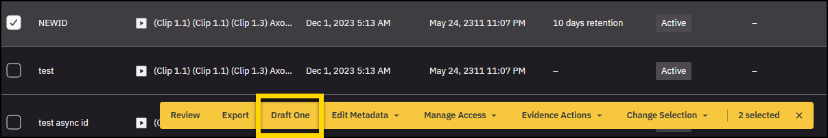 For organizations using Draft One, you can generate Draft One reports directly from the evidence search page. After selecting evidence—including files that are still uploading (status = Processing)—select Draft One from the bulk action menu to start a report.