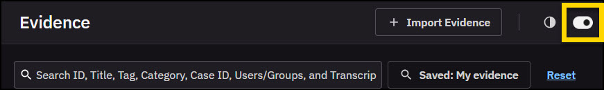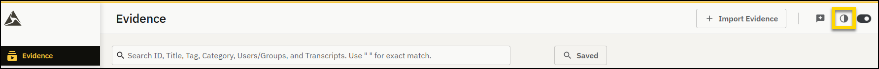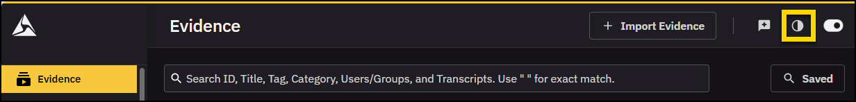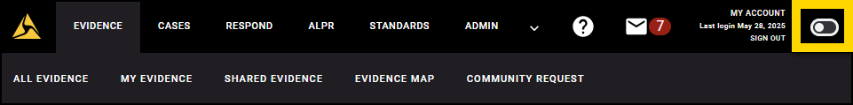 From any page in Axon Evidence, select Switch to dark mode or Switch to light mode to change the display.