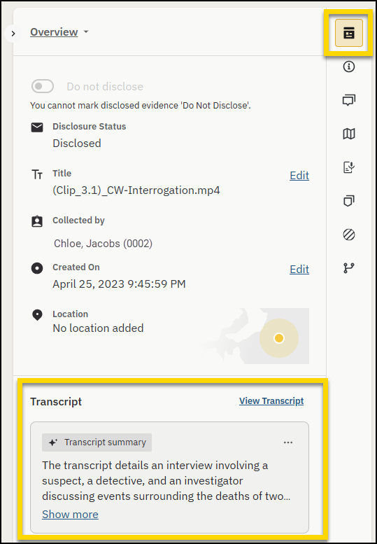 In the Evidence Detail Page, you can view AI summaries from either of these two locations: