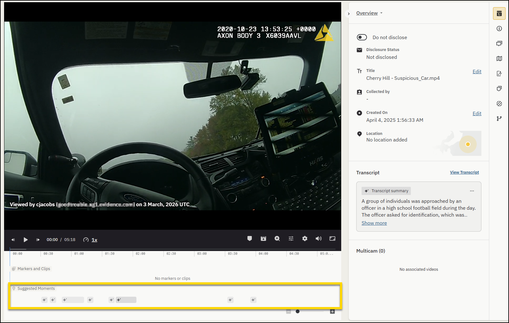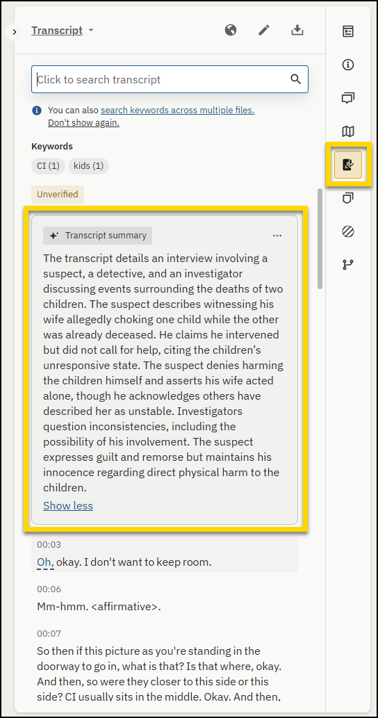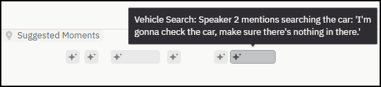 Transcript moments highlight key events in an evidence transcript and add timestamps so you can review important sections faster (for example, Miranda Rights).
