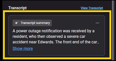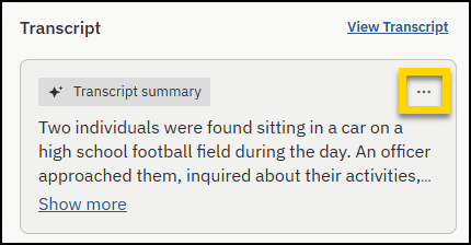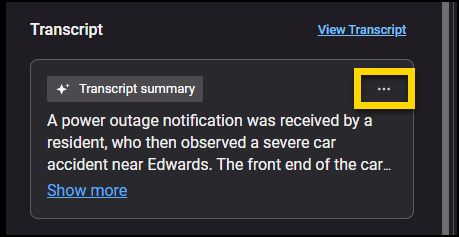 Under Transcript, in the Transcript Summary card, select Show more to expand the summary, or Show less to collapse it.