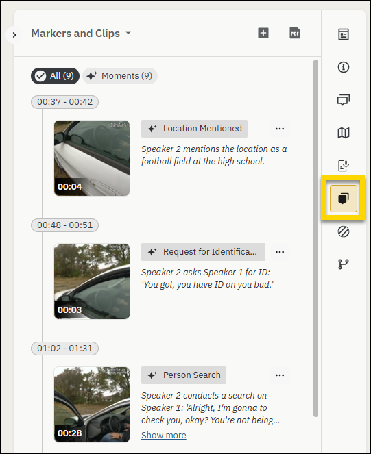 - Markers and Clips: Select the Markers and Clips tab to view a list of moments.