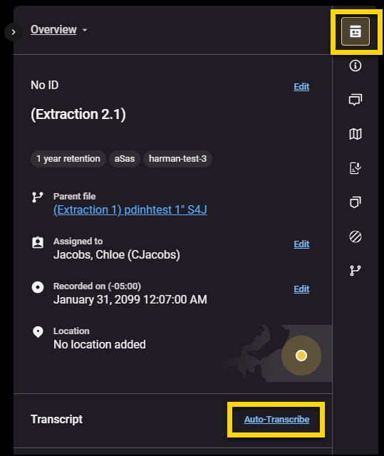 Open the evidence, by selecting a piece of evidence either within your case or from the All Evidence view. The evidence details page opens to the Overview tab.