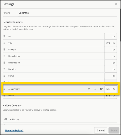 The AI evidence summary displays in the AI Summary column in the evidence table. Hover your mouse over a summary to view the entire summary.