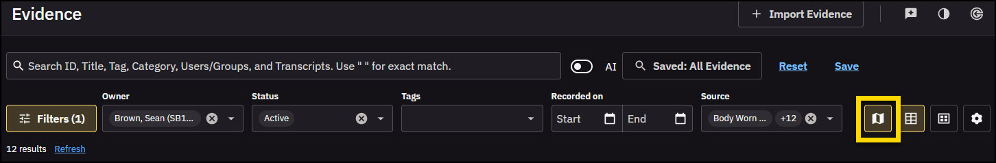 If evidence has recently been added or modified, select Refresh in the evidence list to reload both the table and map with the latest information. This updates timestamps, statuses, and pin locations without reloading the full page.