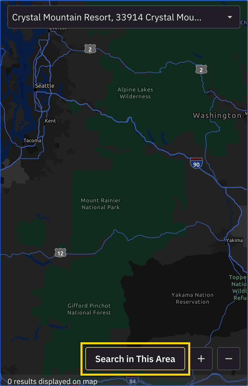 Use the zoom controls on the map to zoom in or out, or manually drag the map to pan to a different area. When the visible area changes, a Search in this area button appears. To update the pins, select Search in this area. The map refreshes to show evidence within the new view.