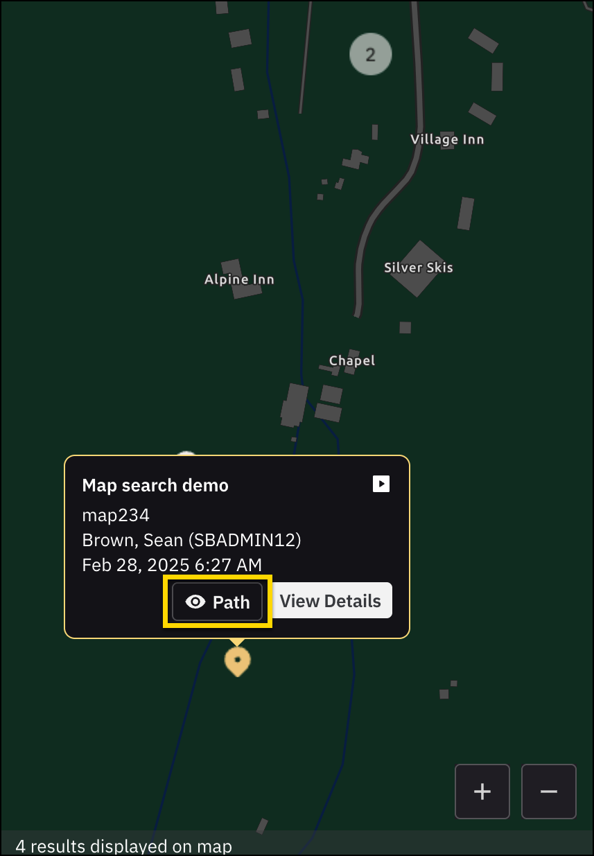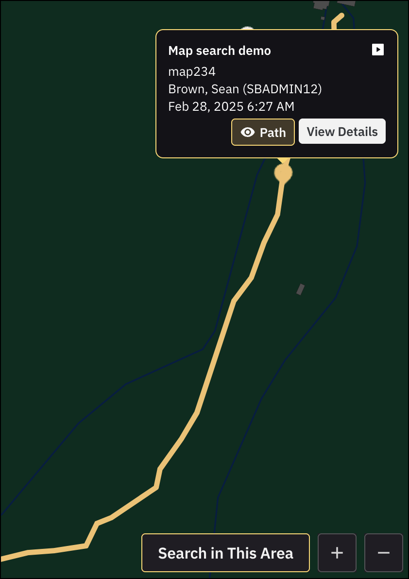 Hover over a pin and select Path to view the route or travel path associated with a recording. The map displays a visual trail between location points captured during the recording. For optimal performance, map paths use sampled coordinates (approximately every 250 feet for body-worn video and every 1,000 feet for Fleet recordings).