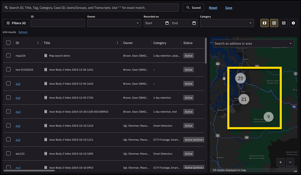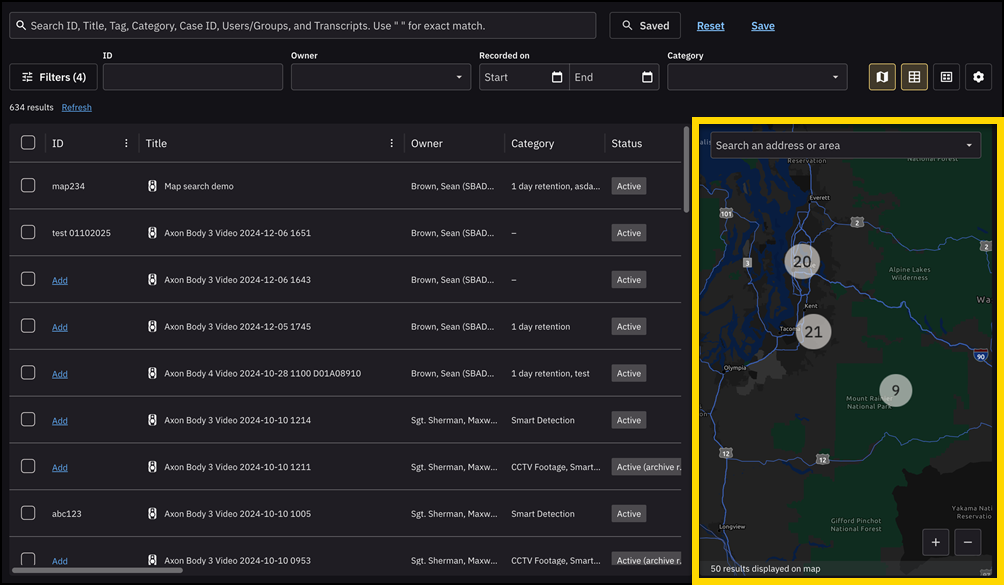 Use map search when you want to explore evidence tied to GPS data, like body-worn camera recordings, vehicle uploads, or mobile capture. The map shows evidence markers at recorded locations, allowing you to zoom in and out, and pan across areas.