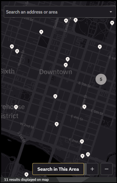 When you move, drag, or zoom the map, the visible results may change. To refresh the pins and list based on your current view, select Search in this area. The map updates to show only the evidence visible within that region.