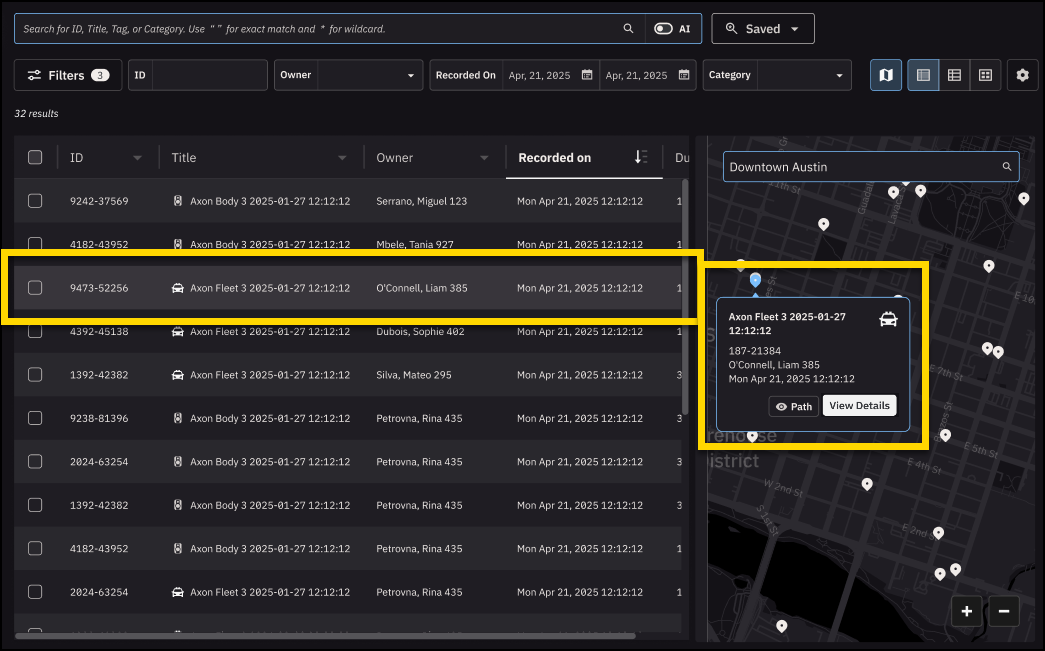 To maintain system performance, map search displays sampled coordinates rather than every GPS point in a recording. For body-worn video, coordinates are sampled roughly every 250 feet. For Fleet recordings, coordinates are sampled about every 1,000 feet. The evidence detail page displays the full path of travel, while the map view on the search page shows these sampled points for faster loading.
